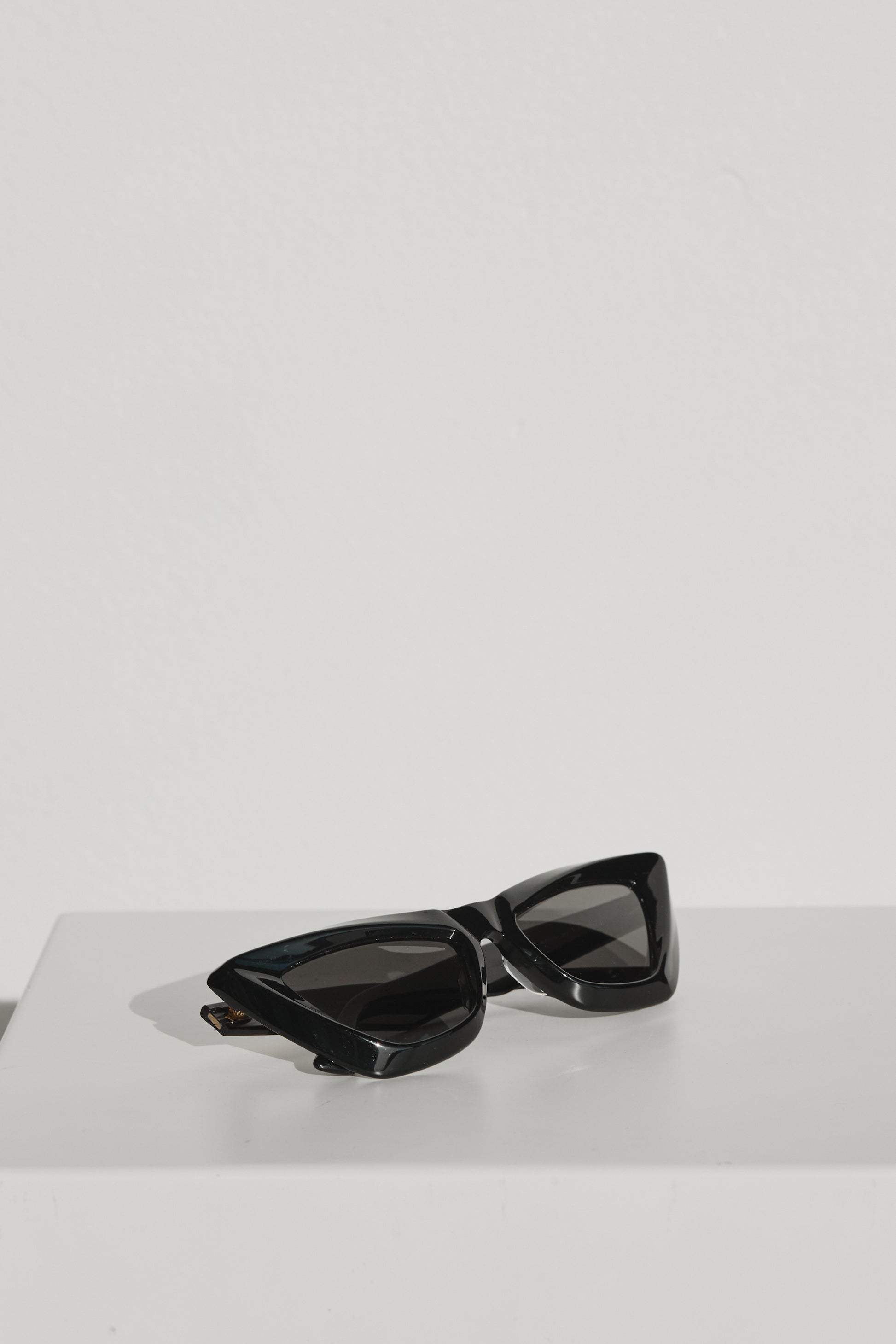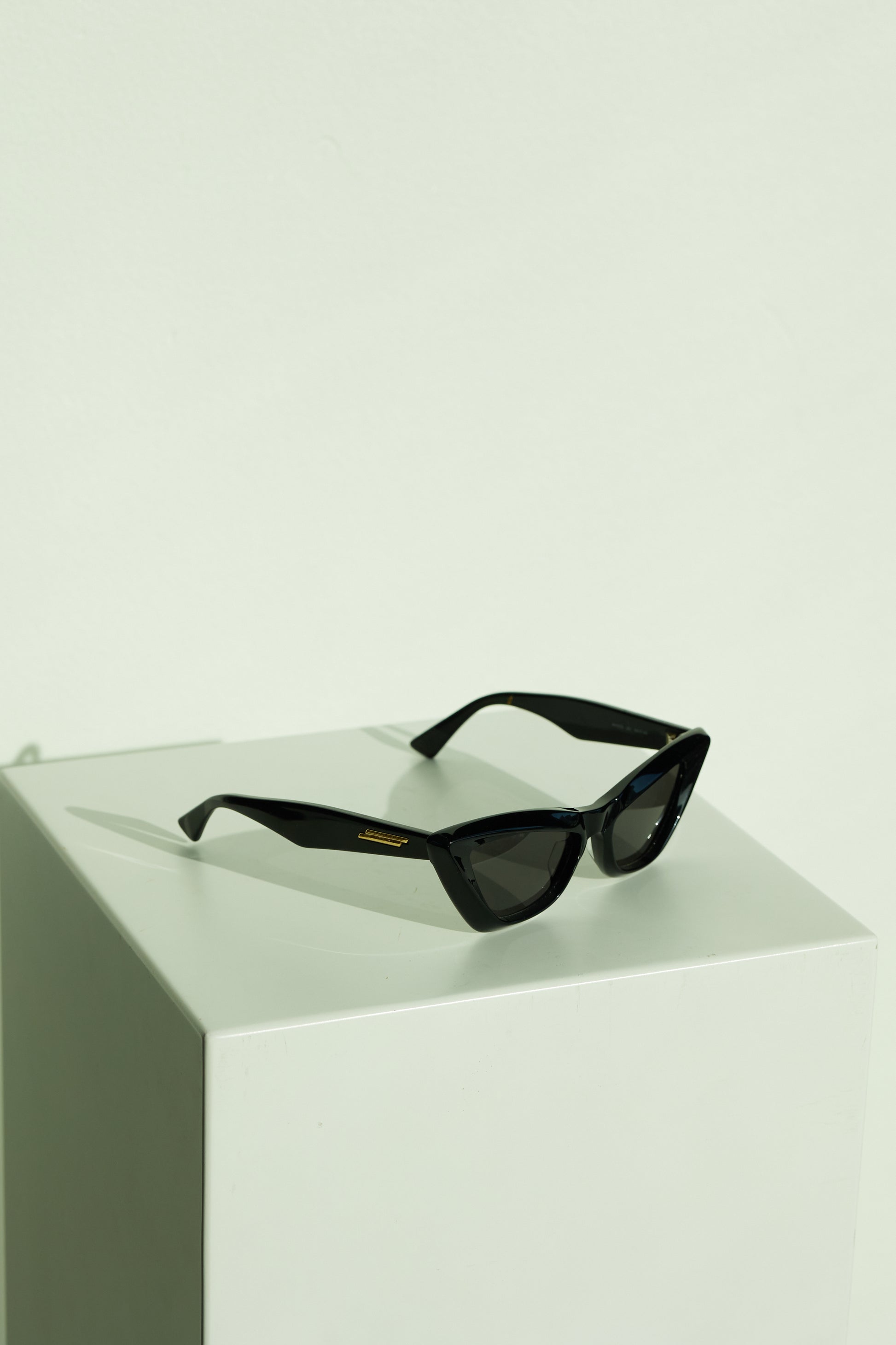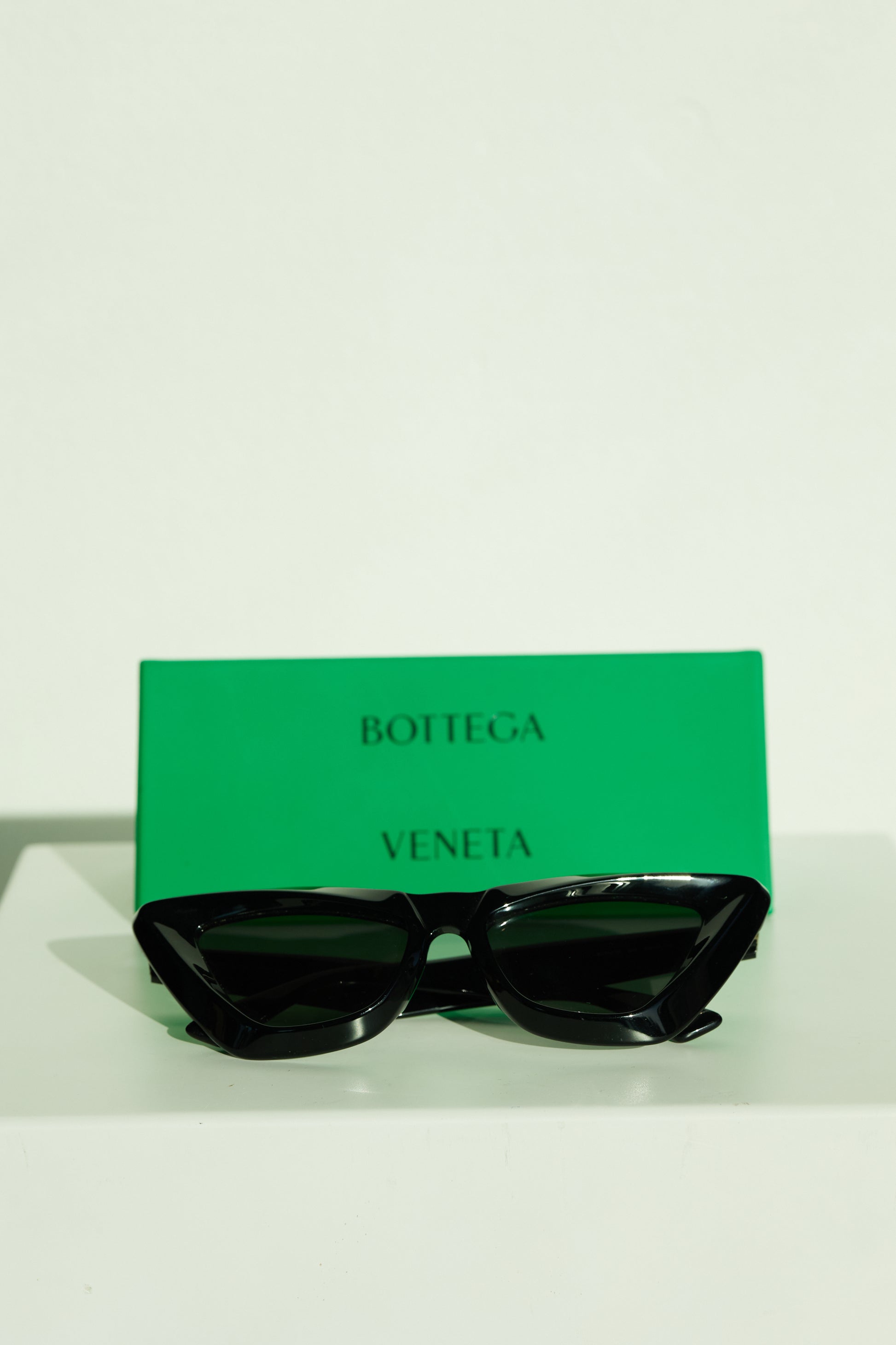 A sculptural statement piece from Bottega Veneta, these black cat-eye sunglasses feature bold, angular frames crafted from glossy black acetate with deep tinted lenses. Designed with the brand’s modernist edge, they offer a striking silhouette that adds instant sophistication to any outfit. A perfect blend of fashion-forward design and functionality.