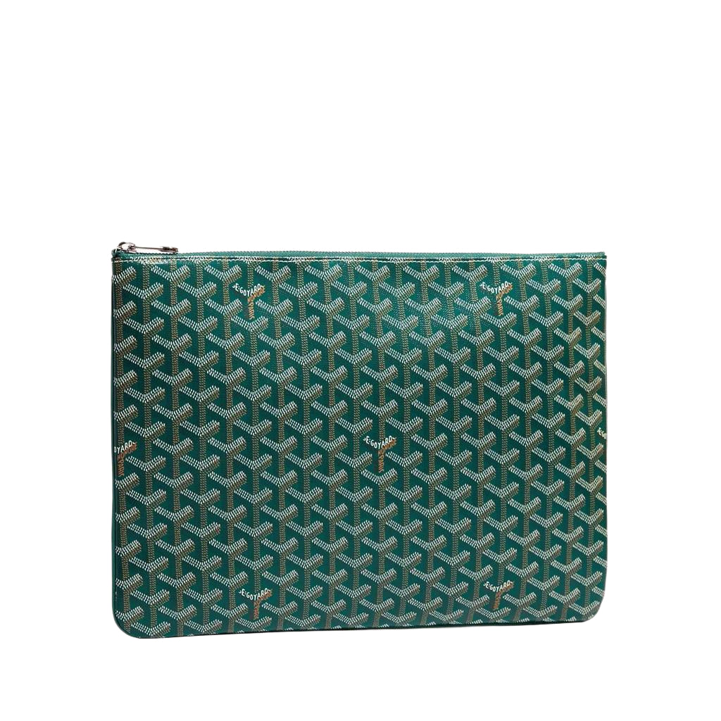 Elegant, versatile, and unmistakably Goyard — the Sénat GM Pouch is a timeless accessory that blends function with refined Parisian style. Crafted from the brand’s signature Goyardine coated canvas and accented with smooth leather trim, this generously sized pouch is perfect for organizing documents, tech essentials, or travel accessories.