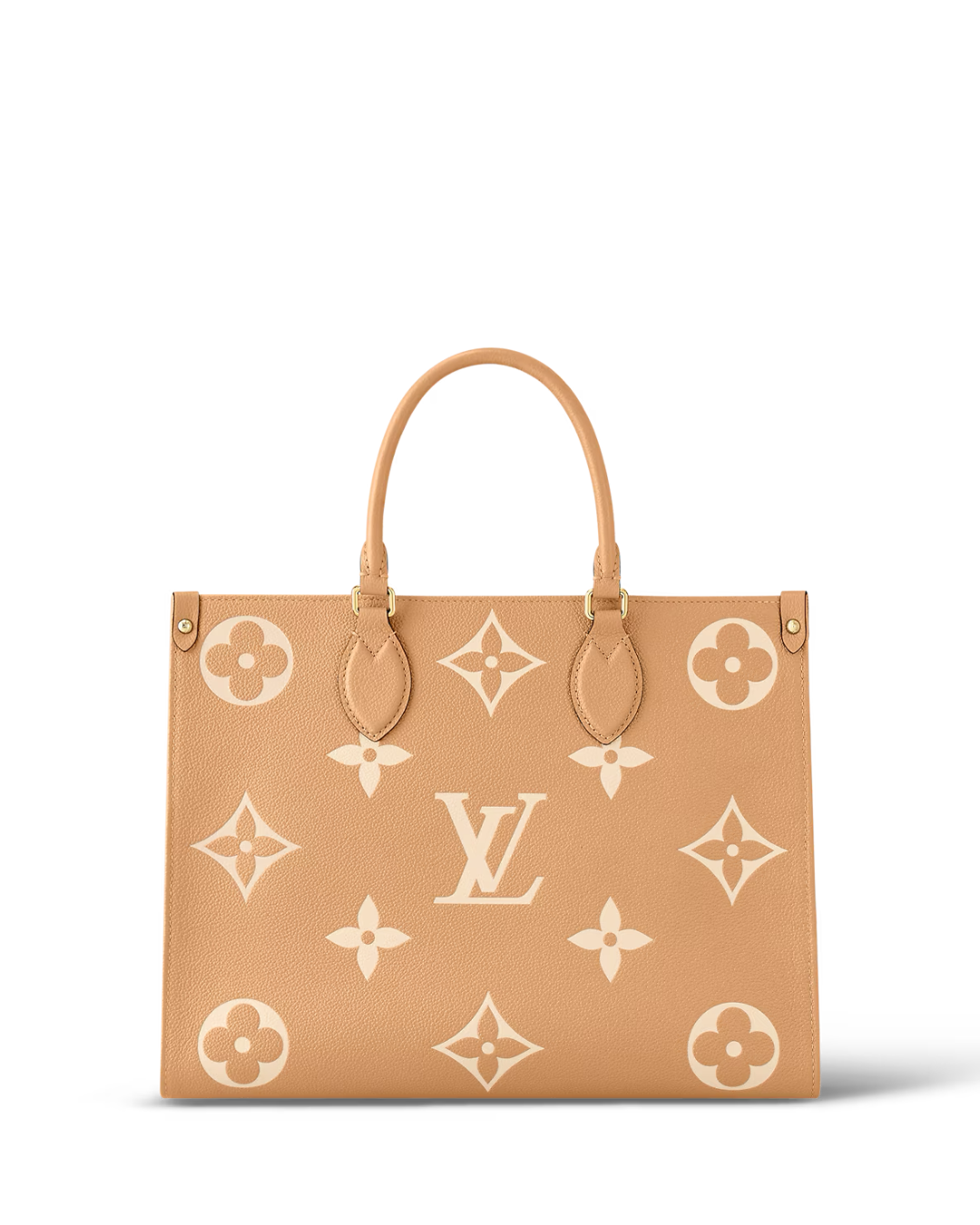 Crafted from Monogram Empreinte grained leather in a sophisticated two-tone palette of Arizona Beige and Cream, the OnTheGo MM tote showcases the iconic Monogram pattern both embossed and printed on the leather surface. Its structured, boxy silhouette offers generous space—perfectly sized to accommodate a laptop and other daily essentials.